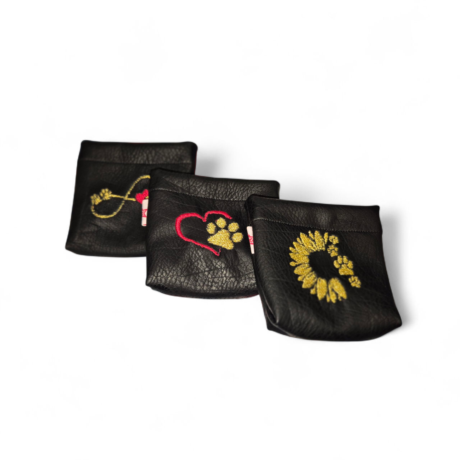 Broderte godbitposer laget av syntetskinn. Mål 10 x 10 cm med magnetlukking. Assortert mønster.